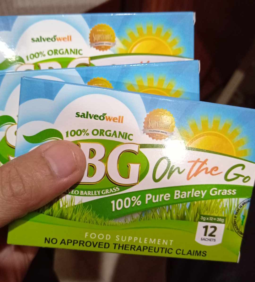 Salveo Barley Grass (SBG) On The Go consists of 12sachets with 3 grams each of pure and organic barley grass. It can accomodate up to 12 servings.